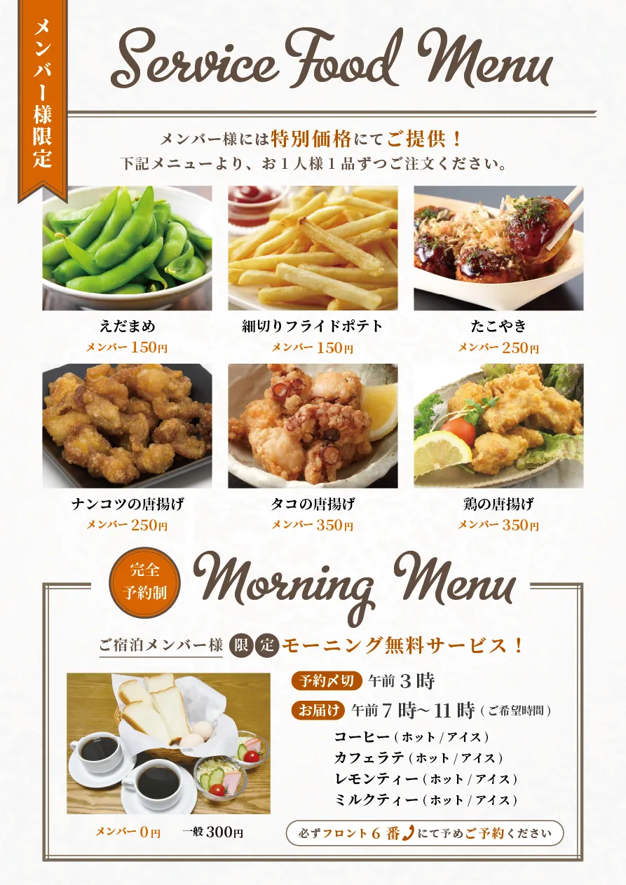 メンバーの皆さま限定で、とってもお得な特別価格にてフードをご提供いたします!ちょっと小腹がすいたときにも、ぜひお気軽にご利用ください。